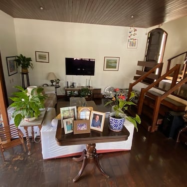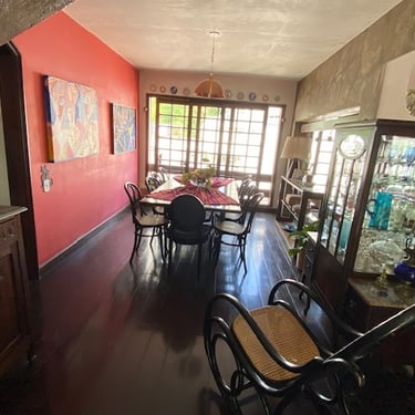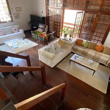 Subindo para o piso intermediário, já na altura da rua, encontra-se o coração da casa: uma sala de estar ampla e iluminada integrada à sala de jantar, varanda, lavabo de apoio, um escritório aconchegante e uma copa-cozinha bem planejada. O layout cria um espaço privado, agradável e muito acolhedor na frente da casa, ideal para momentos em família ou para receber amigos com naturalidade.